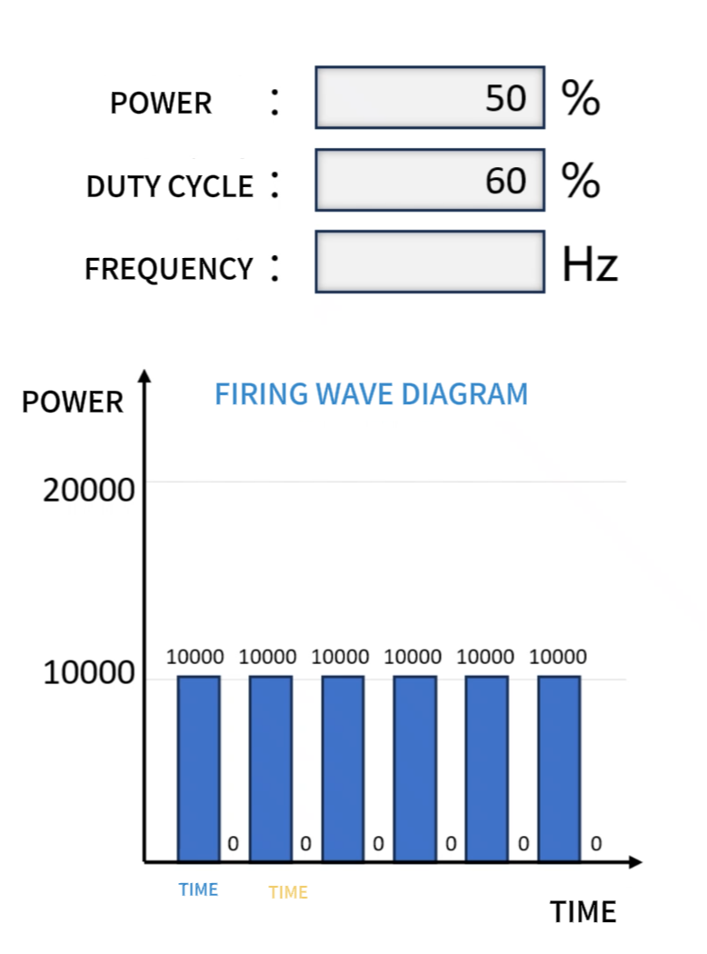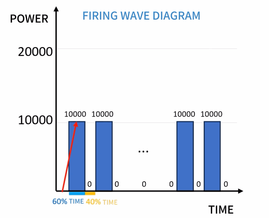Based on the frequency, a 60% duty cycle means the pulse starts with 0.00012 seconds of light (0.0002 seconds × 60%) followed by 0.00008 seconds of light-off (0.0002 seconds × 40%). This completes one emission cycle, while the second emission begins, repeating in a loop.